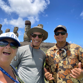 Easter Island was a shining jewel in our travel around the globe. After five days at sea, everyone was anxious to get off the ship. I had booked a private tour, and we ended up with a high tender group, and were supposed to debark at around 8:30, but due to a bunch of circumstances, didn’t get off until close to 11. The tour operator was flexible, and was waiting for us when we arrived into the tiny port. Our guide Itti, was 18, a year younger than Sage and proudly informed us the we were his first English speaking tour. Ay yi yi! He was of Rapa Nui descent and did a nice job. Jess treated him as her son, and I think that he learned to drive the day before! He crashed into another car trying to park, and said that it was his first crash! AyYiYi!